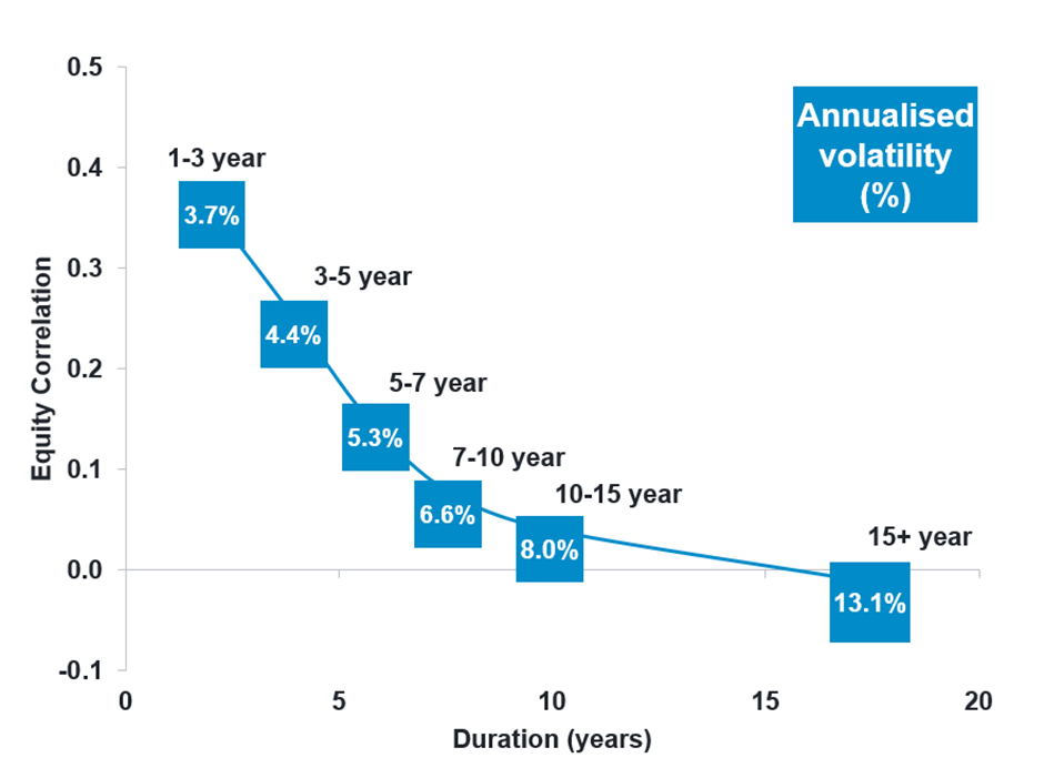 Higher duration levels and lower equity correlations are something that can be observed over the longer term as well. Looking at data from 2002 and simulating different duration levels by adding excess returns of the Sterling Corporate Index onto different UK Gilt Indices by maturity, we can see that greater duration levels are associated with lower equity correlations. However, there is no free lunch, one must be willing to shoulder the greater volatility that comes with taking more interest rate risk. As shown, the 1-3yr part of the curve is associated with an equity correlation of +0.4 and a long run annualised volatility rate of 3.7%, versus the 15+ year part of the curve at a 0.0 correlation but with volatility at over 13%.