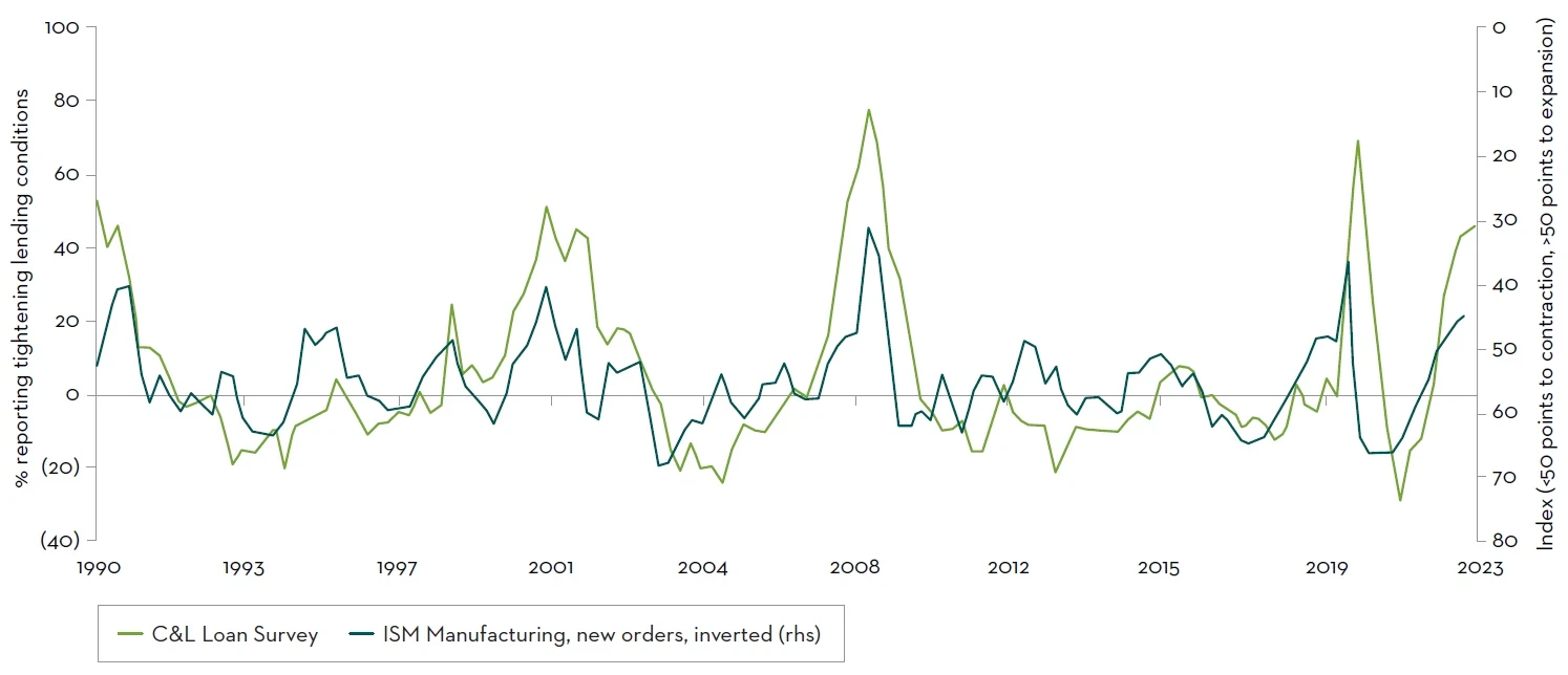 The reason that the market has been particularly focused on credit lending conditions is the close relationship between those, and the ISM Manufacturing* new orders data, as can be seen in the chart below, this is the US purchasing manager index. There is a strong correlation between tightening credit conditions and deteriorating ISM manufacturing new orders. This is shown by the increasing number Commercial and Industrial (C&L) survey respondents reporting tightening lending conditions (light green line).