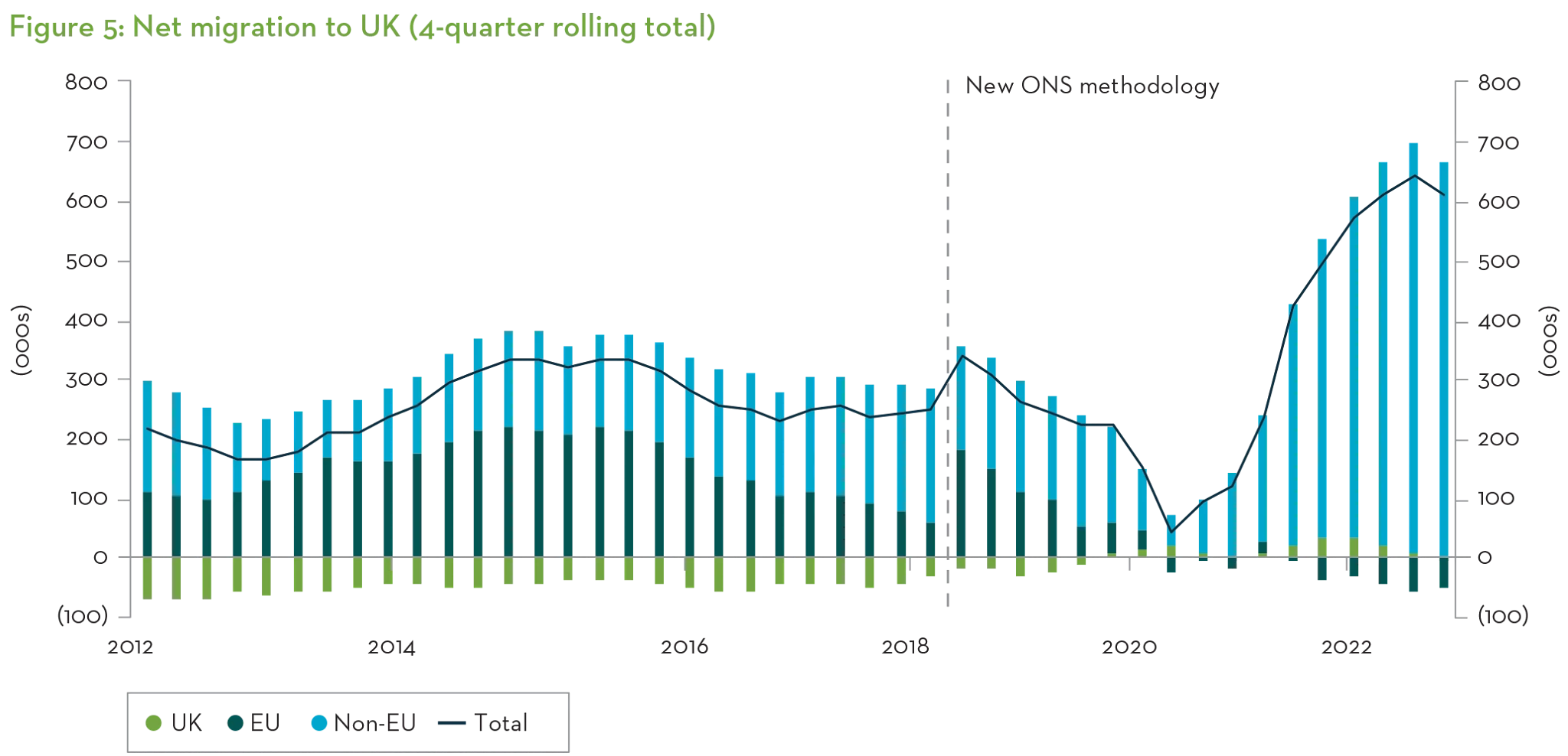 Inward net-migration to the UK rose to an all-time calendar year high of 606,000 last year (figure 5). But the nature of immigration has shifted significantly from unskilled EU labour in favour of skilled, non-EU labour in recent years. This coincided with a historically tight labour market in 2022 but a disproportionate degree of vacancies exist in low-skilled jobs which were historically undertaken by EU workers. With skilled, non EU workers ineligible to take many of these positions due to visa conditions, it is no surprise to see these sectors contributing more to growing wage pressures thus inflation. Whilst the net skilled immigration is not totally offsetting this impact, there is a structural trend at play here.