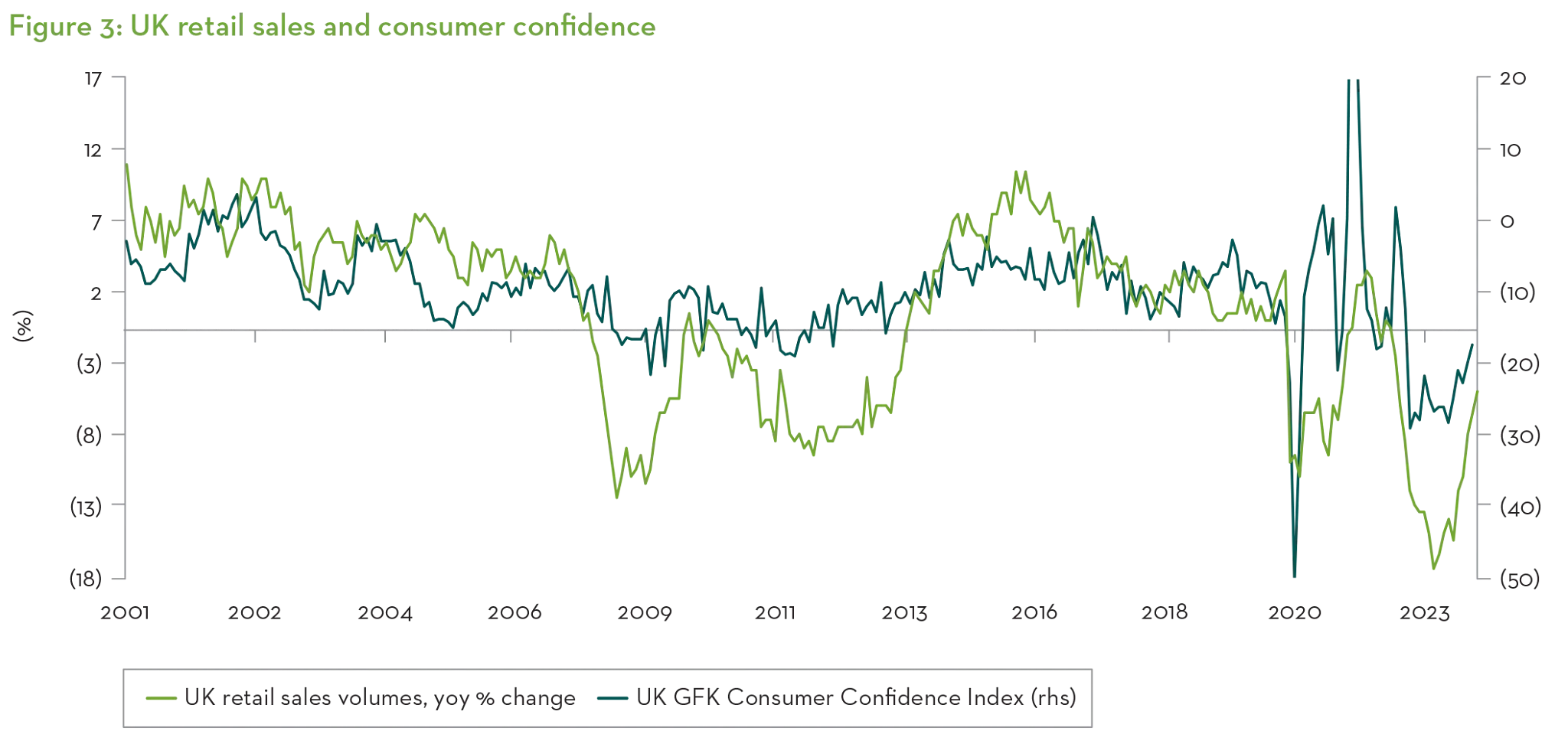At first this interest rate trajectory would seem disastrous for already squeezed consumer budgets, but we believe that retailers will reap reward in the months ahead as consumer confidence continues to demonstrate resilience (figure 3).