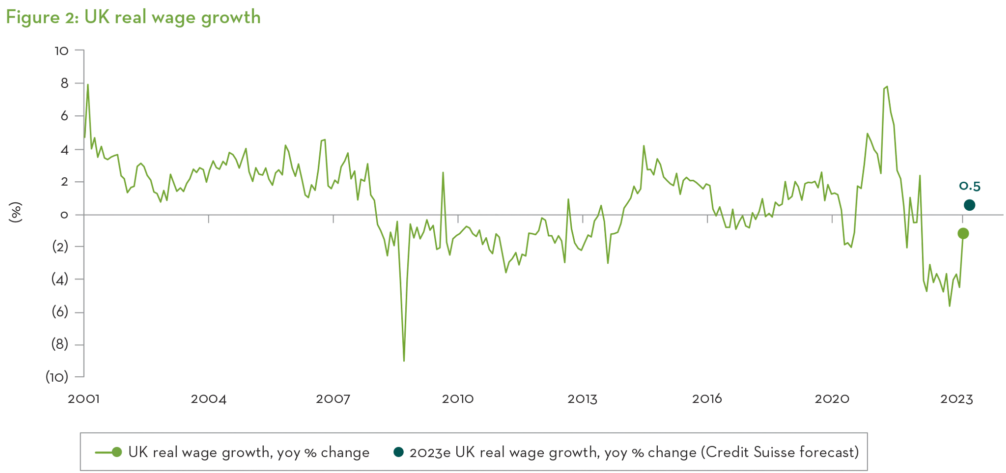 We must be aware of the inflation story within the UK where core inflation is defying global trends, exceeding both the Eurozone and the US. A significant contributor to this pain is the degree of private sector wage growth within the UK, which after a period of moderation is now starting to accelerate and is up at 8.2%. In real terms however, wage growth does remain negative although this is expected to turn positive later this year should inflation abate as expected (figure 2).