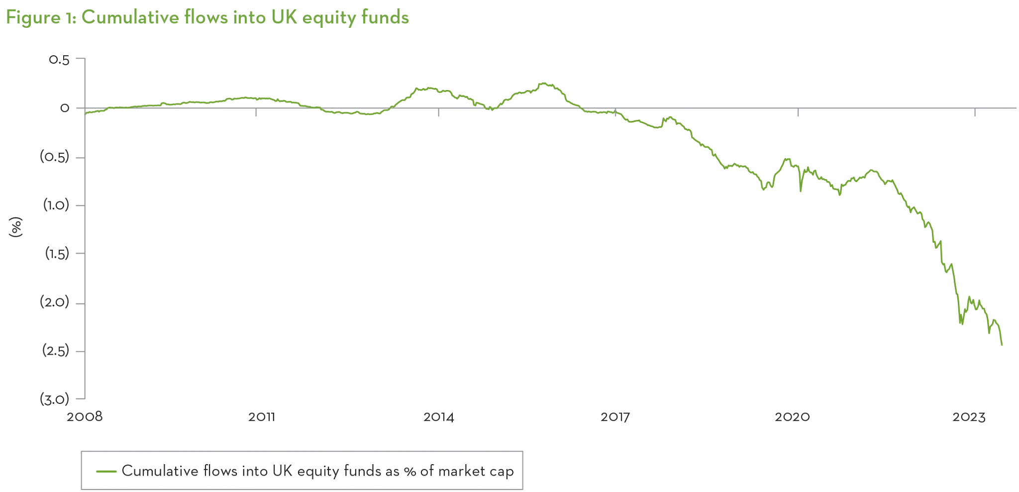 Times have been tough for the UK since 2016 when pollers marginally voted to leave the European Union. Investors fearful of hampered international trade and sluggish growth shunned the region en masse, and strategic asset allocations followed suit (figure 1). But today the economy demonstrates many unique characteristics which, after a period of strong relative returns for the FTSE, may lead institutional investors to reconsider their tactical and strategic UK equity allocations, and could attract capital flows into the region.