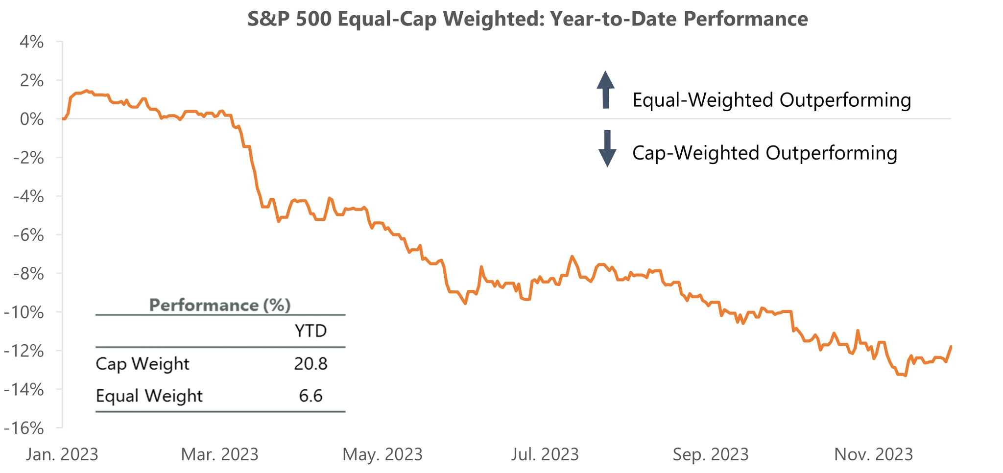 In addition to trying to read the economic tea leaves, we believe that market breadth provides valuable insights about the durability of future market performance. While this year’s market return has been better than we expected, its underlying performance is far more varied and nuanced than one might assume by just looking at the S&P 500. Year-to-date returns have been disproportionately driven by the top seven weightings of the S&P 500, which have accounted for approximately 70% of the overall index return (as of November) and earned the nickname the Magnificent Seven. As a result, large cap growth strategies have surged this past year. In contrast, all value styles, as well as all small cap categories, have trailed those stocks by approximately 30 percentage points.
