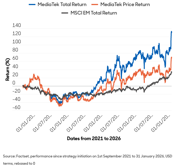 We first invested in MediaTek in 2021. Since then, it has continued to increase dividends, supported by rising profitability and a disciplined balance sheet. A combination of regular and special dividends, from September 2021 to January 2026, has delivered an impressive 31% cumulative yield. Cashflow strength means MediaTek can sustain payments through market volatility – a valuable capability for income strategies.