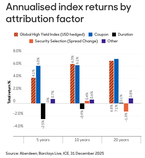 Looking at the numbers, over five, 10 and 20-year periods, coupon income has accounted for close to 100% of total returns in global high-yield.