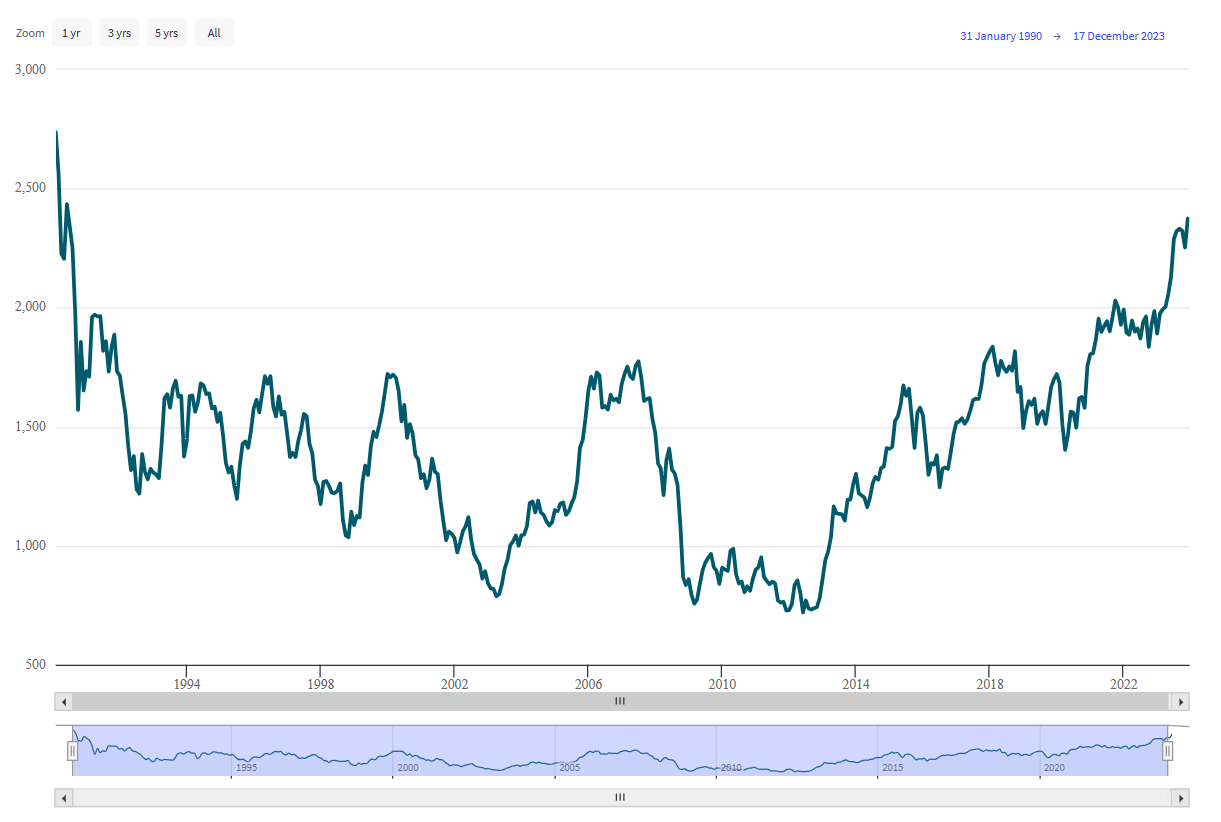 As with most other major economies, Japan’s inflation rate increased after the world’s emergence from COVID-19 lockdowns and the global supply-chain pressures that followed Russia’s invasion of Ukraine. Inflation reached 4.3 per cent in January 2023; it has fallen slightly since then but remained at 2.6 per cent in December – above the BoJ’s two per cent inflation target.4