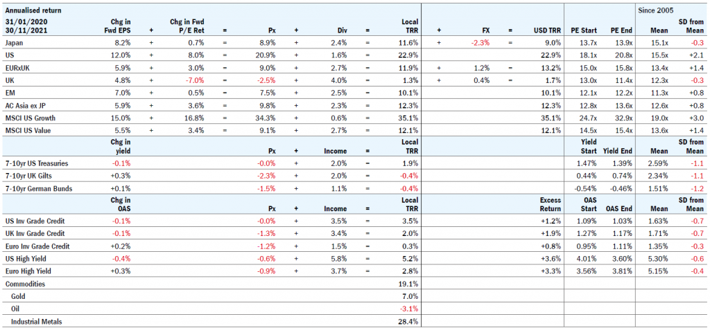After the shock Covid-19 recession of 2020, global economic growth bounced back in 2021. Earnings soared more than was forecast, and the prospect of monetary tightening emerged with inflation proving less transitory than hoped. Taking the Covid period in its entirety, equity returns have been strong and government bond returns have been weak, with credit outperforming government bonds, and industrial metal price rises boosting commodity returns (Figure 1).
