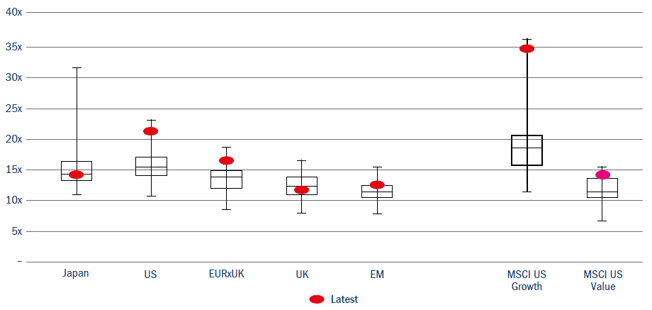 Figure 3: 30 November 2021 equity market forward PE multiples against 15-year history