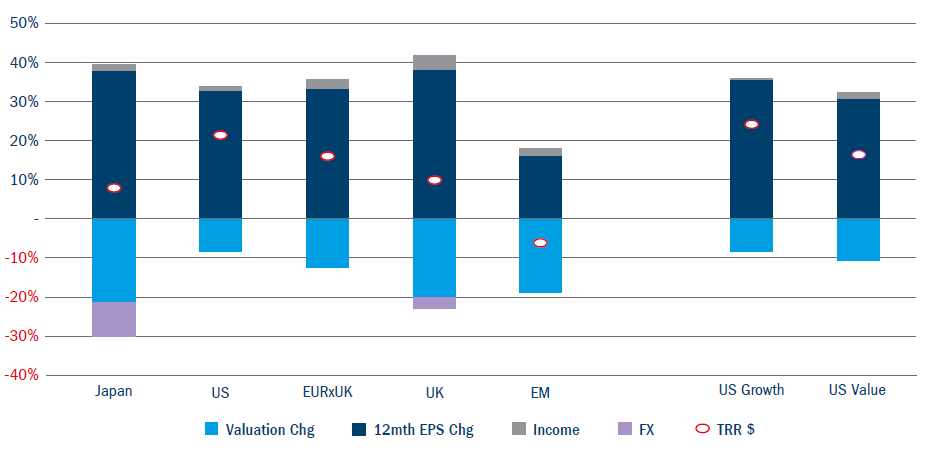 So how does the Covid period break down? Stocks in every major region of the world except the US saw their expected earnings power grow at a mid-to-high single-digit rate; in America the growth rate was around twice this pace. Digging a little deeper we can see that US Value performed much like other regions of the world, and it was only US Growth stocks that stand out as exceptional.