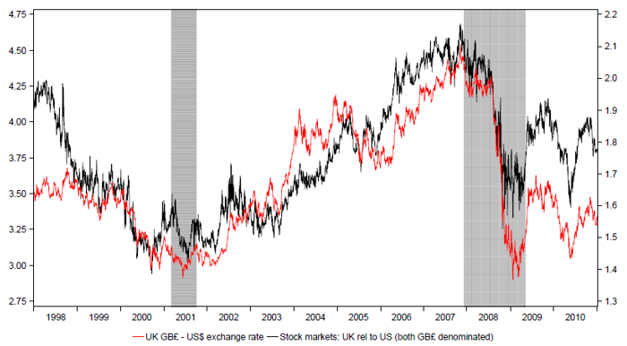 Figure 3: UK stock markets relative to US (shown with GB£-US$ spot rate)