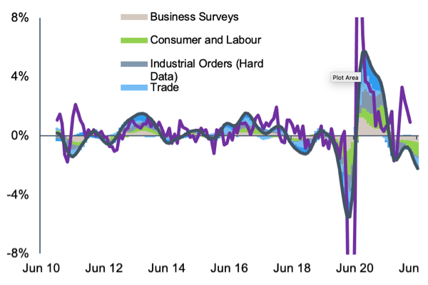 The Consumer and Labour sector moved further into the ‘bottom-left’ quadrant. The decline in Consumer confidence worsened and was broad-based across US, Germany and France, led by inflation pressures. The labour market remained strong with some moderation, with US jobless claims inching marginally higher and France’s vacancies decelerating.