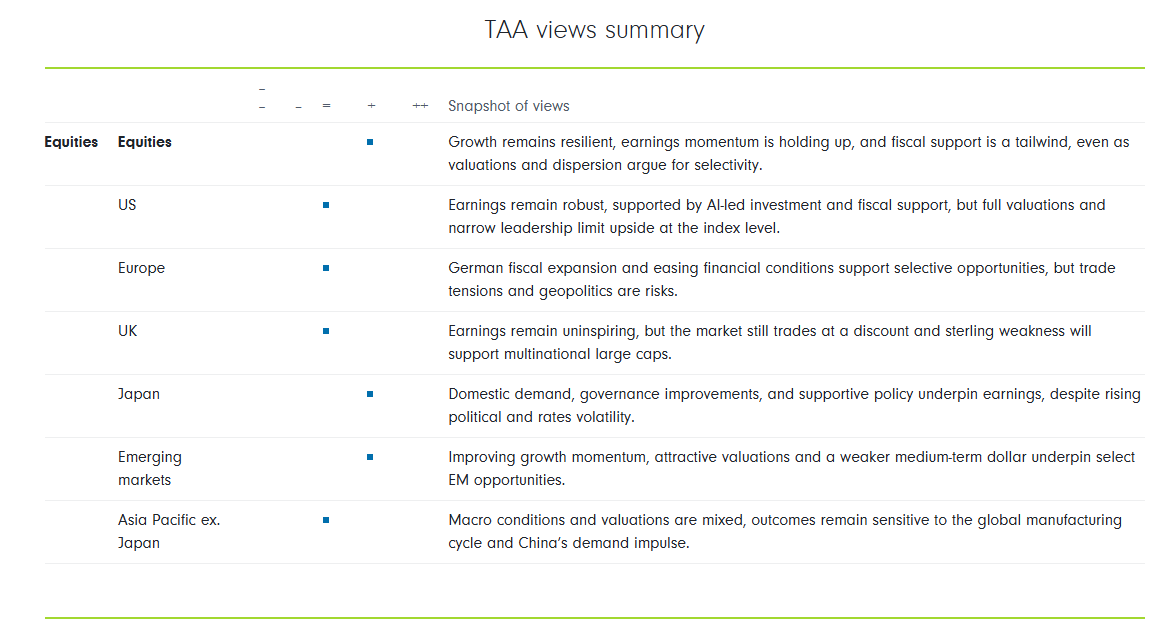 Source: Fidelity International, January 2026. Views reflect a typical time horizon of 12–18 months and provide a broad starting point for asset allocation decisions. However, they do not reflect current positions for investment strategies, which will be implemented according to specific objectives and parameters. Regional equity views use universes defined by MSCI indices.