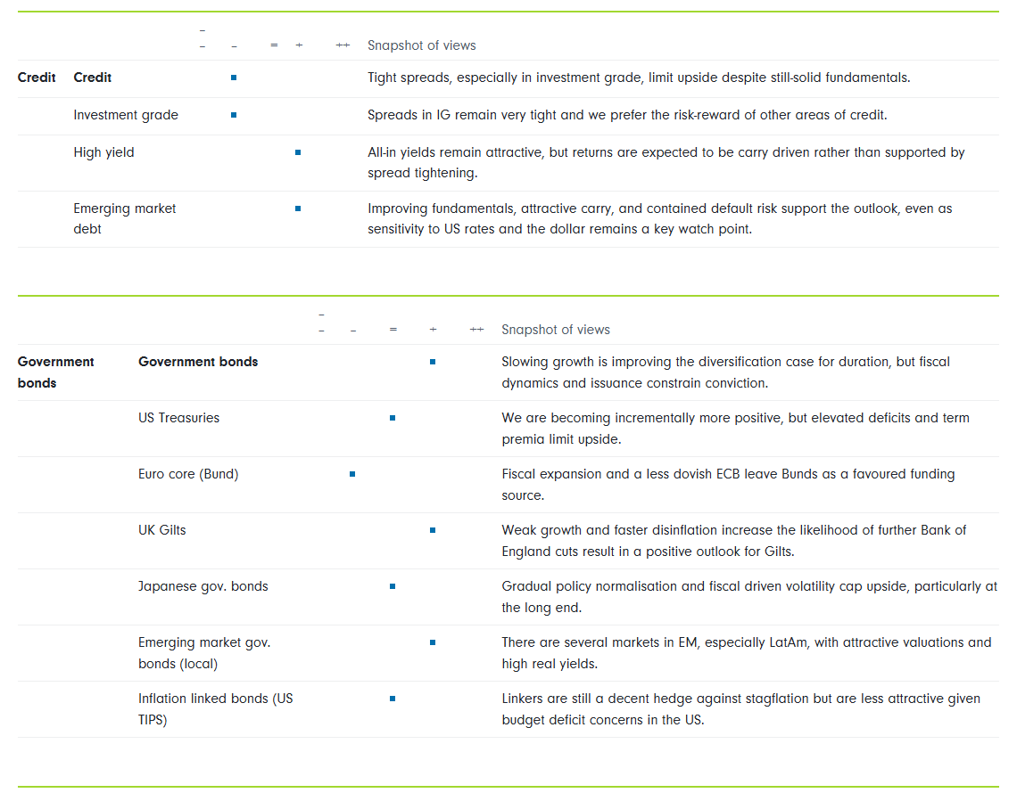 - We have become more constructive on duration as growth concerns increasingly outweigh inflation risks, and government bonds are regaining some diversification value in portfolios. While valuations are not uniformly compelling, selective opportunities exist across regions and tenors.