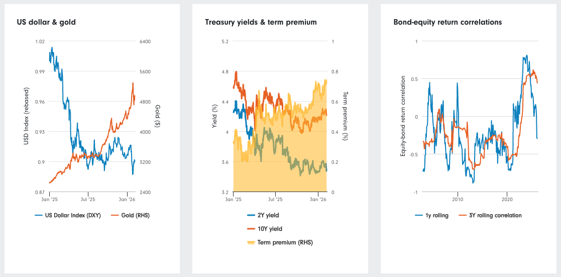 These dynamics have important implications for investors. Long-term bonds provide a source of higher nominal income, but equity and fixed income returns could remain more correlated and the ability of duration exposure to hedge equity risk may remain reduced (outside of a recession scenario). There is also greater risk that high long-term Treasury yields could catalyse bouts of equity market volatility; this has historically often been the case when 10-year yields rise above 5% (per the Fed Stock Valuation Model). The potential for such an outcome is worth monitoring closely amid changes to the Fed’s leadership, particularly given that the valuations of real assets like equities arguably benefitted from an ‘easy money’ dollar debasement narrative in 2025.