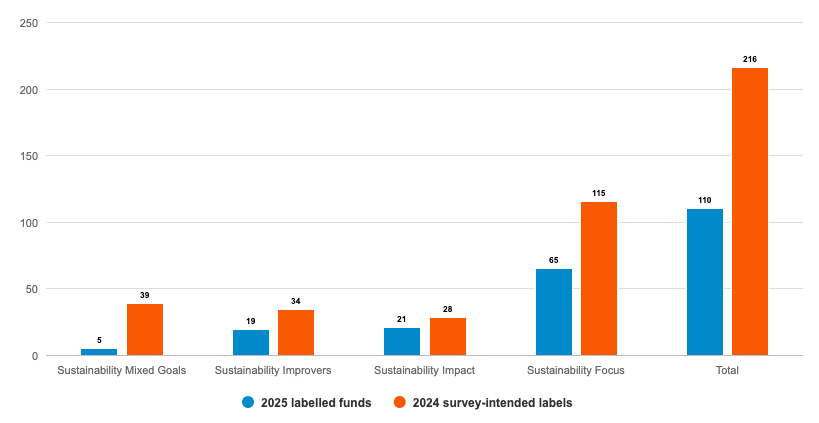 While this rigour enhanced internal standards and increased transparency for clients, getting disclosures right took time and resource, and created backlogs for the regulator’s authorisation process. This resulted in a temporary forbearance for those funds seeking a label to comply with the Naming and Marketing rules from December 2024 to April 2025. In the end, fewer funds that had been anticipated applied and qualified for a sustainable label, according to a survey in June 2025 by the Investment Association (see chart).