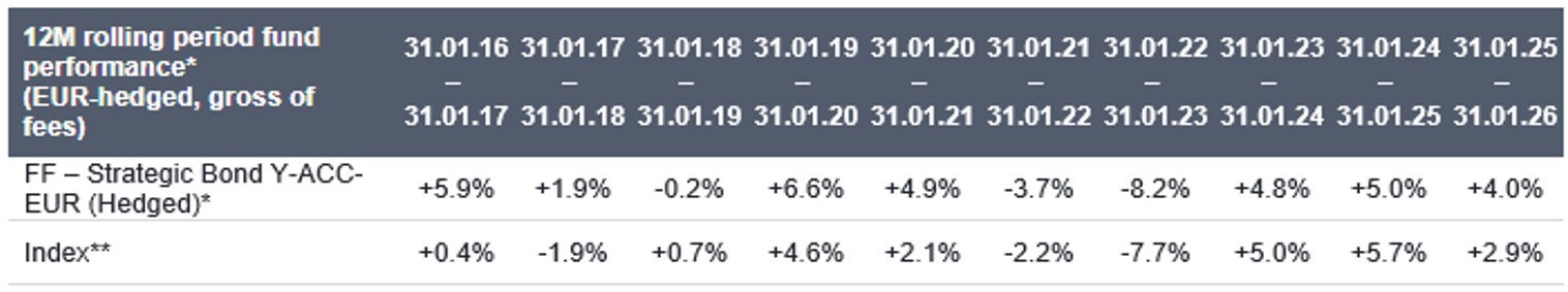 Source: Fidelity International, 28 February 2026. *Fund performance reflects FF Strategic Bond Y-ACC-Euro (hedged) shares, nav-nav with income reinvested, gross of fees (Ongoing Charges Figure of 0.77% per year applies to Y shares). The Y-ACC-Euro (hedged) share class was launched on 8 March 2011. **Index and relative returns reflect the Strategic Asset Allocation Blend (ICE BofA Q944 Custom Index) until 28 April 2025 and thereafter the Bloomberg Global Aggregate Total Return Index (Currency hedged). Performance data is quoted at the fund's official valuation point. Please note that numbers may not sum exactly to totals shown due to the rounding of figures. Please also note: FF Strategic Bond fund’s name was changed on 19 July 2024 (formerly the FF Sustainable Strategic Bond Fund).