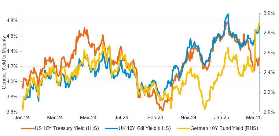 Source: Bloomberg, 12 March 2025. Data based on GT10 Govt, GUKG10 Index and GDBR10 Index.