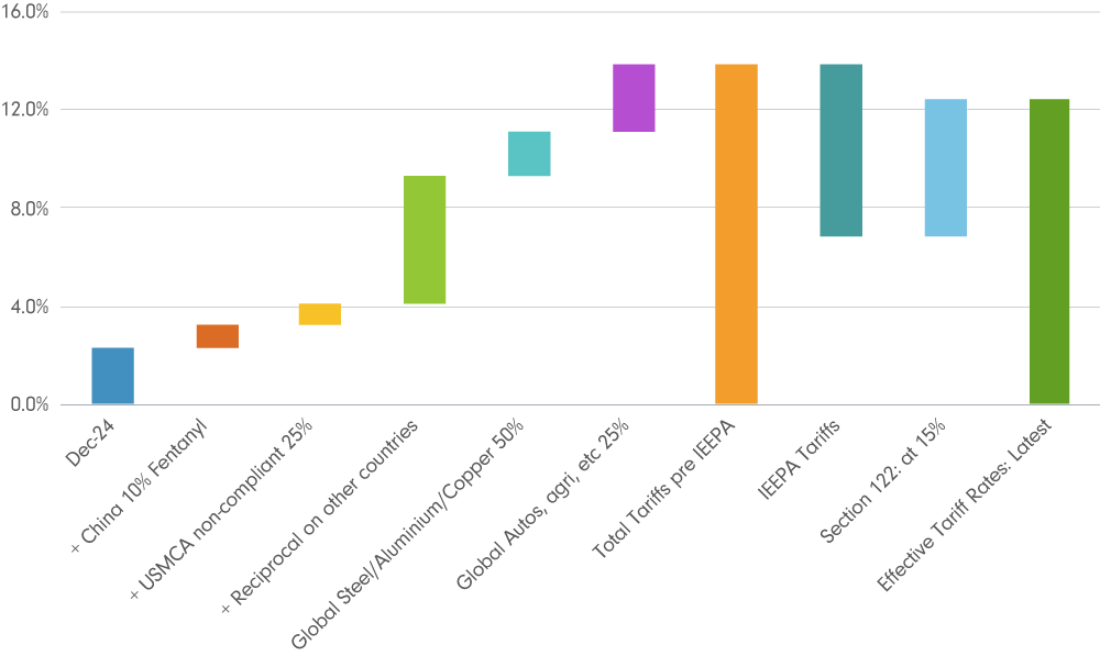 That said, there is a modest appeasement of the policies, at least in the near term until the prior structures get rebuilt. As per our estimates, the combination of the IEEPA ruling and the new 15 per cent Section 122 tariff lowers the effective tariff rate (ETR) by about 1.5 percentage points to 12.4 per cent. We are still reviewing the exemptions outlined in the executive order but currently assume they broadly mirror those under IEEPA.