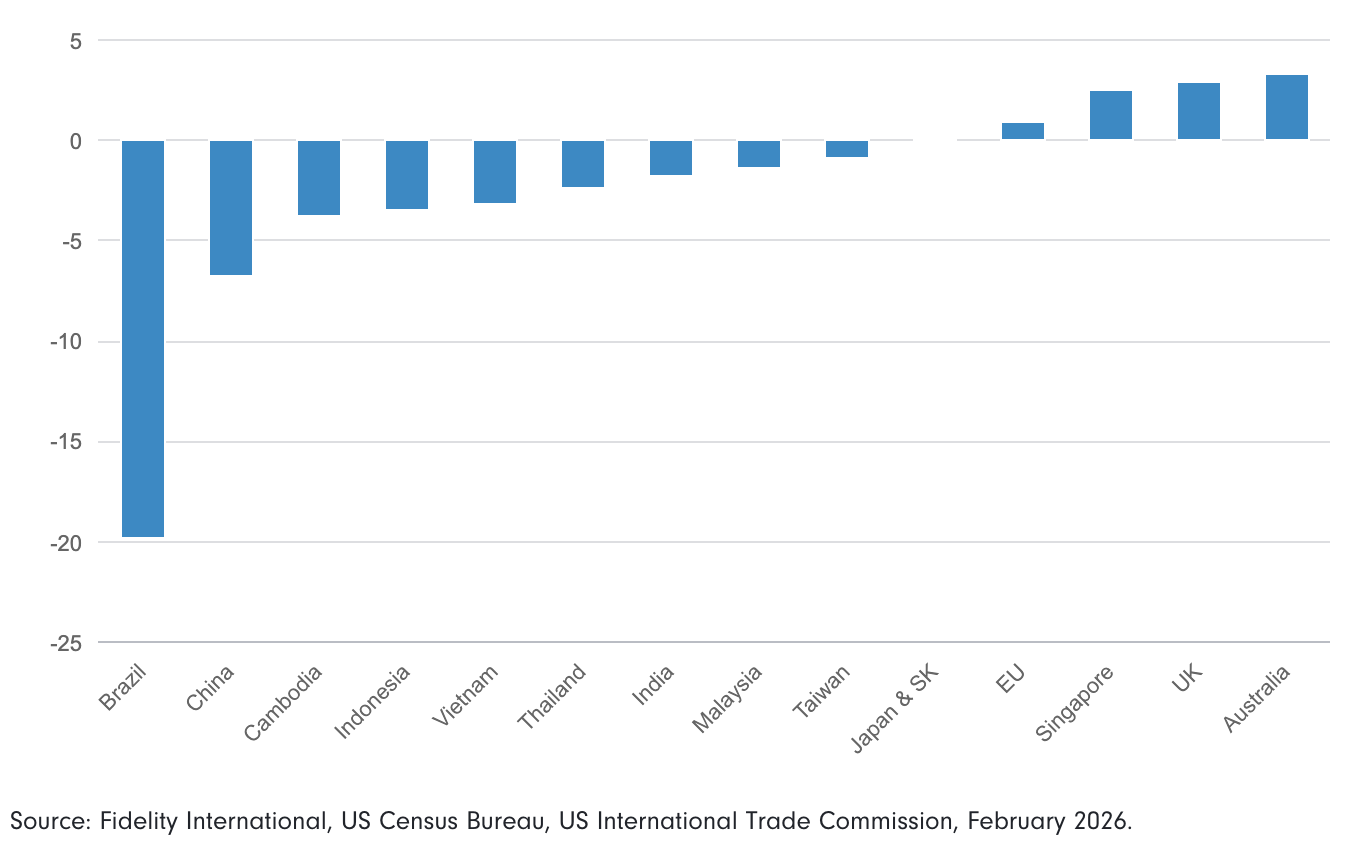 China: China is a relative near-term beneficiary of the IEEPA rollback and shift to a temporary 15 per cent Section 122 regime, with estimates suggesting its average tariff burden declines by some 7 percentage points. This reduces immediate escalation risk ahead of the Trump–Xi meeting scheduled for the end of March. However, follow-up actions remain likely, and broader tensions over export controls, supply chains and technology persist.