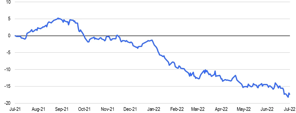 The complicated nature of the current environment has negatively impacted small- and mid-cap stocks more than larger listed businesses. From July 2021 through July 2022, the mid-cap stocks represented by the FTSE 250 Index had nine months of underperformance versus the FTSE All-Share Index.1 The spread between these two indices shows a dramatic style rotation—an increasing demand for more defensive areas of the market and a reducing of perceived riskier areas, such as mid-cap stocks.