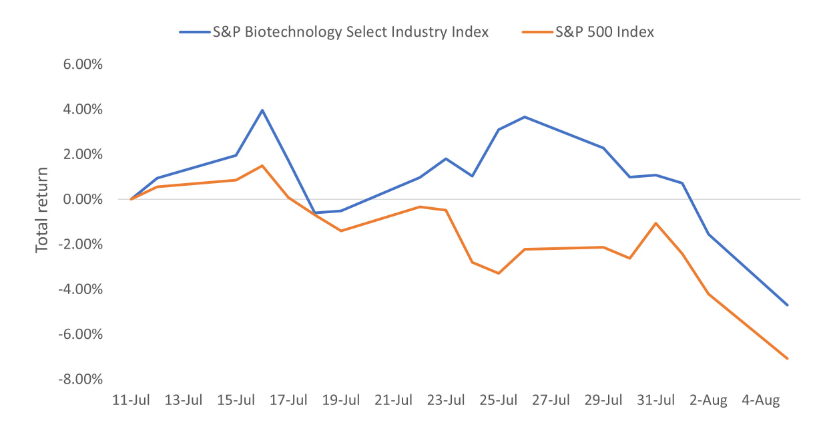 Source: Bloomberg. From 11 July 2024 to 5 August 2024. The S&P Biotechnology Select Industry Index represents the biotechnology sub-industry portion of the S&P Total Market Index. The S&P Total Market Index is designed to track the broad U.S. equity market, including large-, mid-, small-, and micro-cap stocks.