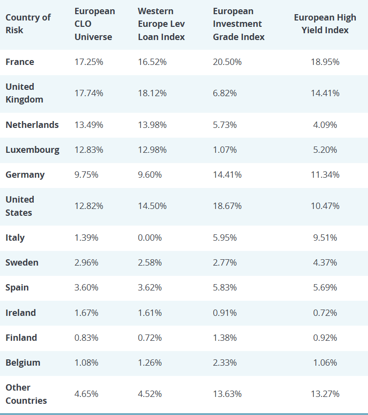 Figure 7: Geographical representation across European CLOs, loans and corporate credit