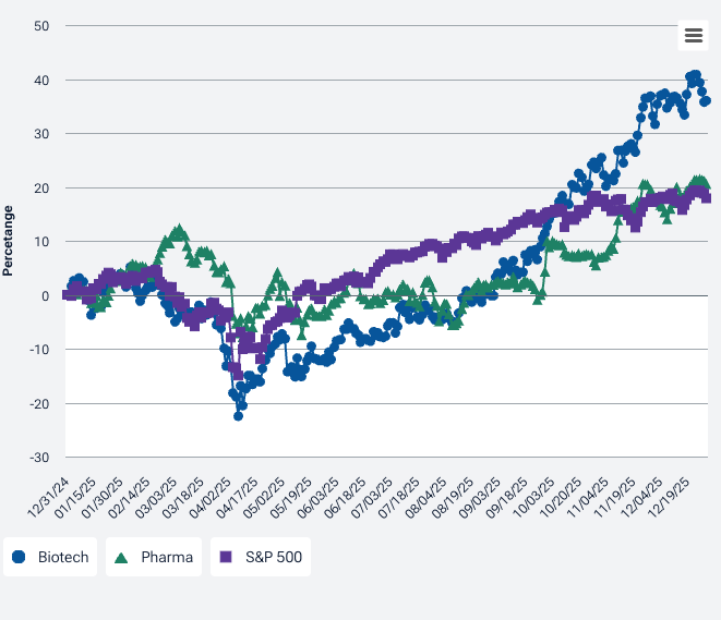 Biotech is represented by the S&P Biotechnology Select Industry Index. Pharma is represented by the NYSE Arca Pharmaceutical Index. S&P 500 is the Standard & Poor’s 500 Stock Index.